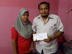 HULU LANGAT, 16 Jun 2016 - Penerima, Encik Alius Alimin tidak mampu melakukan kerja-kerja berat selepas ditimpa kemalangan di mana kaki beliau dipasang skru penguat tulang. Kini beliau bersama isteri, Puan Norhayati Rahim bersama-sama mengusahakan perniagaan menjual satay. Suami isteri ini berniaga di bawah khemah di bangunan Pertubuhan Peladang dengan pendapatan purata RM800 sebulan, bergantung kepada permintaan.