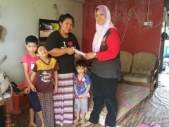 CHERAS, 15 Jun 2016 - Penerima SKR, Irna Syafiena bt Abdul Rahman, ibu tunggal yang baru sebulan ditawarkan bekerja sebagai penyambut tetamu hotel di Sri Petaling dengan pendapatan mengikut jam, RM 4/sejam. Syafiena bersama 6 orang anaknya, Norhanani Insyira (9 tahun), Norhadina Insyira (7 thn), Norharmuni Insyira (6 thn), Muhammad Haikal Irsyad (5 tahun), Norhalisya Insyira (4 tahun) dan Muhammad Naqarsh Irsyad (3 tahun) tinggal di Flat Sri Kota, Cheras. Mendapat bantuan dari Baitulmal sebanyak RM 500/sebulan. Menggalas tanggungjawab hidup bersama 6 anak yang masih kecil menjadi cabaran besar bagi Syafiena kerana kerja yang mengikut syif memaksa beliau meninggalkan anak-anak kecil berdikari sementara beliau keluar bekerja. Keluarga ini boleh dihubungi, Syafiena (018-2602411). Sumbangan disampaikan oleh Cik Rosmaiza Mohammad, Pegawai YBK.