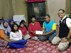 Haslinda Idris merupakan ibu tunggal dengan lima orang anak. Kehilangan suami kira-kira setahun yang lalu cukup memberikan kesan kepada keluarga ini. Puan Haslinda tinggal di Permatang Keriang, Penaga dirumah peninggalan arwah suaminya. Kesemuanya 5 anaknya masih bersekolah dan 2 daripadanya adalah anak istimewa. Ibu ini mendapat sedikit bantuan bulanan dariapada Kerajaan Negeri untuk anak istimewa ini. Selain daripada itu Pn Haslinda turut bekerja membasuh pinggan digerai berhampiran dengan pendapatan RM10 sehari. Kehadiran kami menyampaikan sumbangan SKR 2016 ini memberikan sedikit keceriaan pada keluarga Pn Haslinda. Sinar kasih Ramadahan di Pulau Pinang ini bersama dengan Yayasan Ehsan Permatang Sintok. Maklumat dan cadangan keluarga penerima ini disampaikan oleh saudara Syafik dan saudara Rosli.