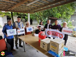 Turut bersama, Encik Ahmad Syukry Ibrahim (Pengarah Hal Ehwal Islam dan Perhubungan Kerajaan Mamee-Double Decker (M) Sdn. Bhd.), Cikgu Muhamad Fadzli Misman (Guru Penolong Kanan Hal Ehwal Murid, SK Sungai Serai), dan sukarelawan daripada Persatuan Penduduk Taman Sri Nanding.